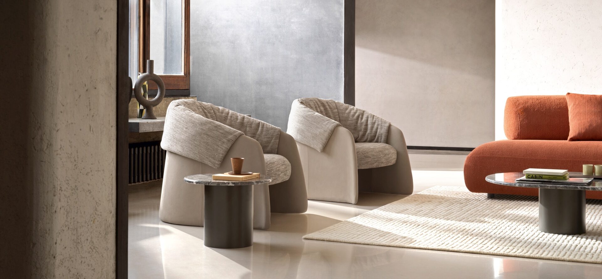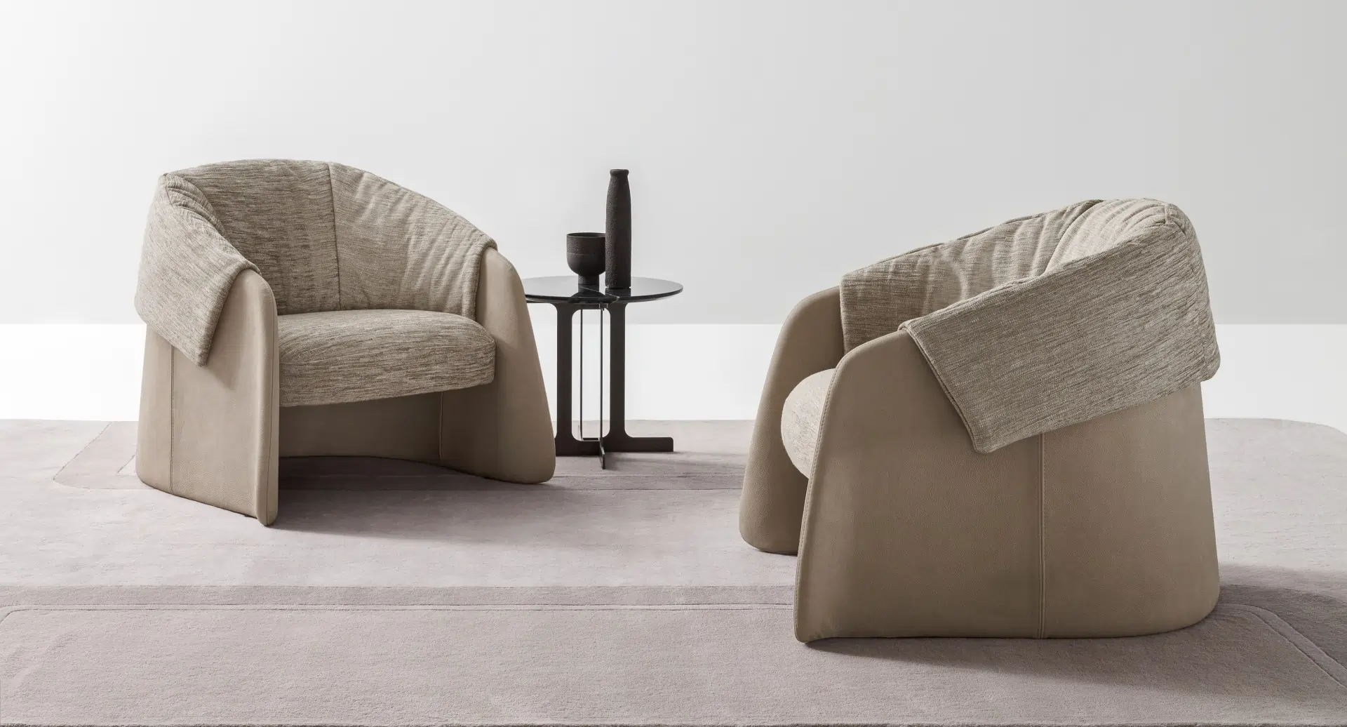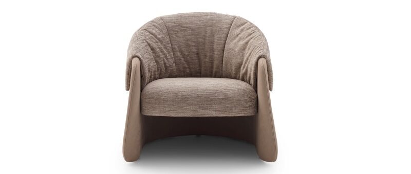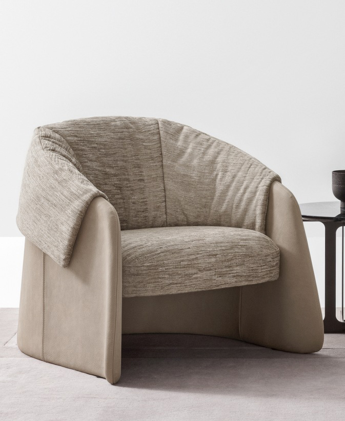 A delightful and harmonious overlapping of different materials brings to mind the characteristic shape of the lapel on a blazer. Blazer is an elegant armchair, which is compact in size yet with perfectly balanced proportions and can be customised with several upholstery covers, choosing between leather and fabric.