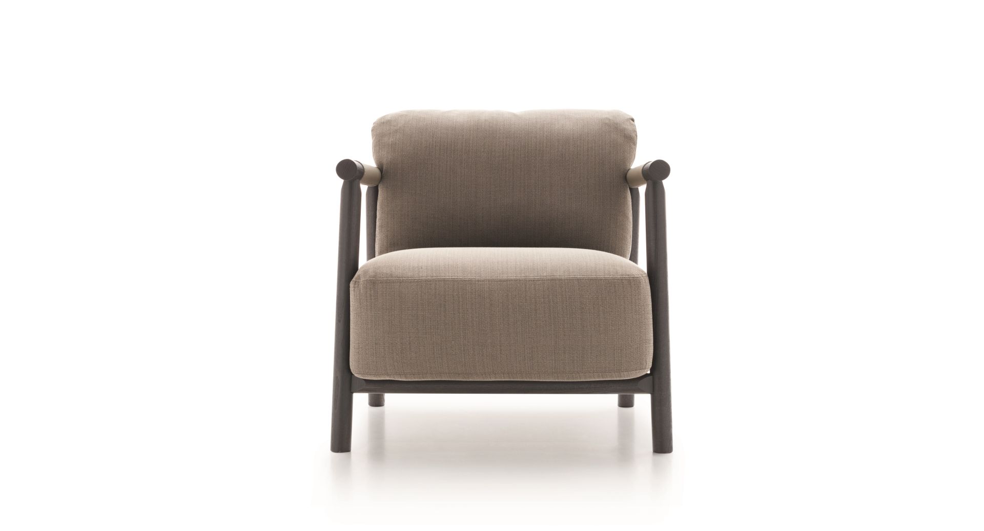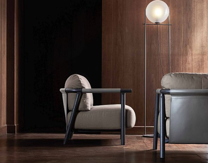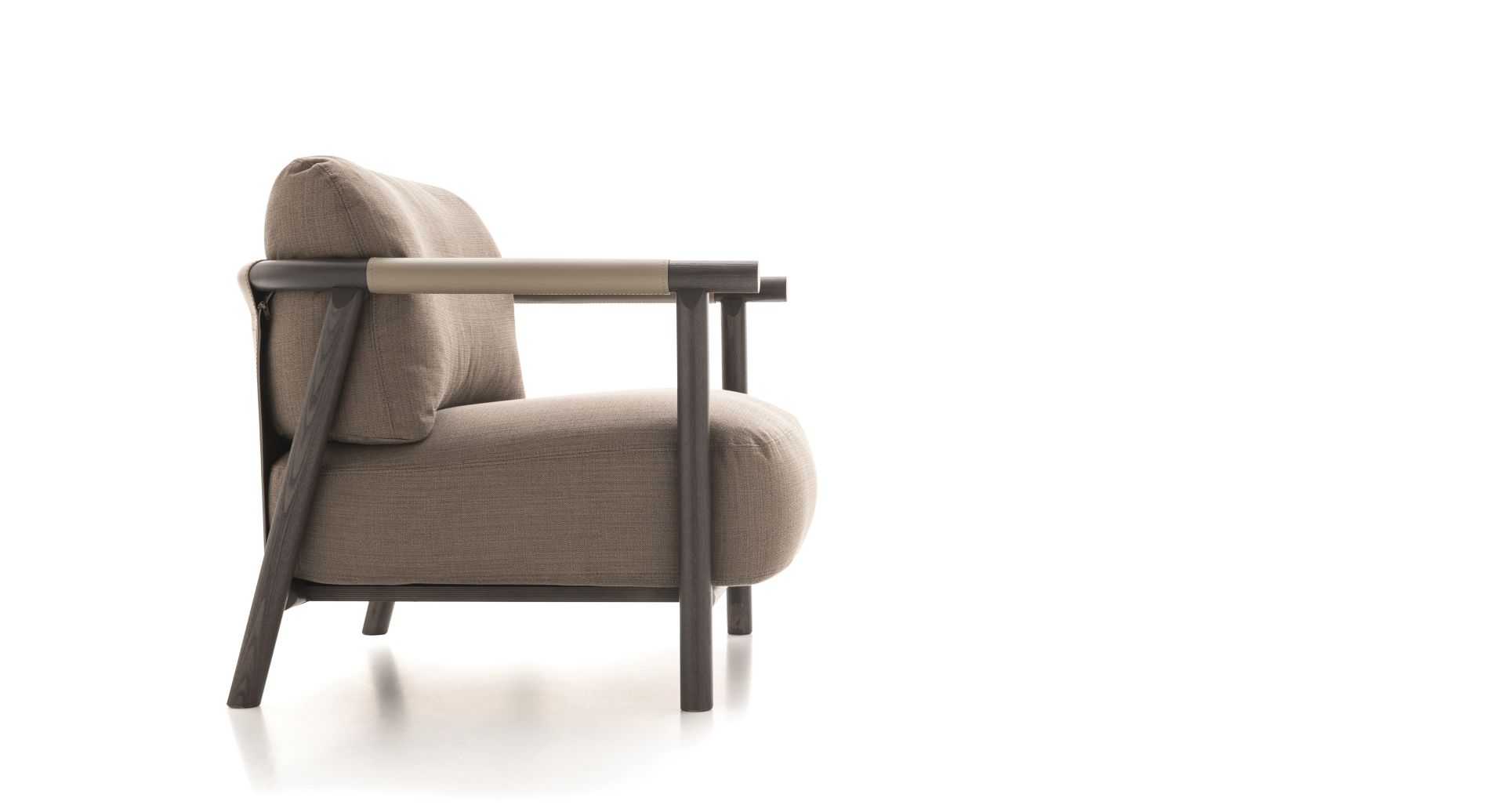 Paired with sofas arranged into an island to favour conversation, or standing by itself next to a coffee table for a comfortable read, Nathy is always an iconic presence on the domestic scene. Sheets of natural leather are stretched over the wooden frame of the armchair to define and contain the shape of the soft, wraparound seat and backrest cushions.