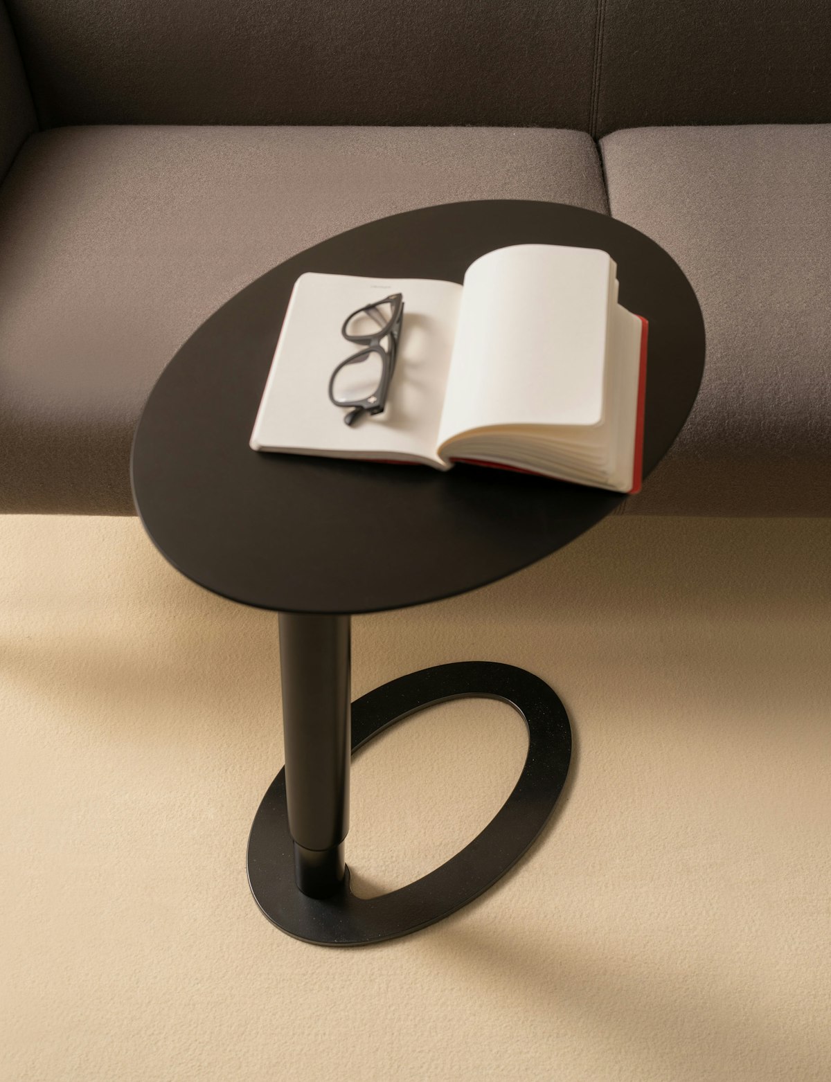 Oval table made with steel base and gas column for the height adjustment of the HPL table top.
