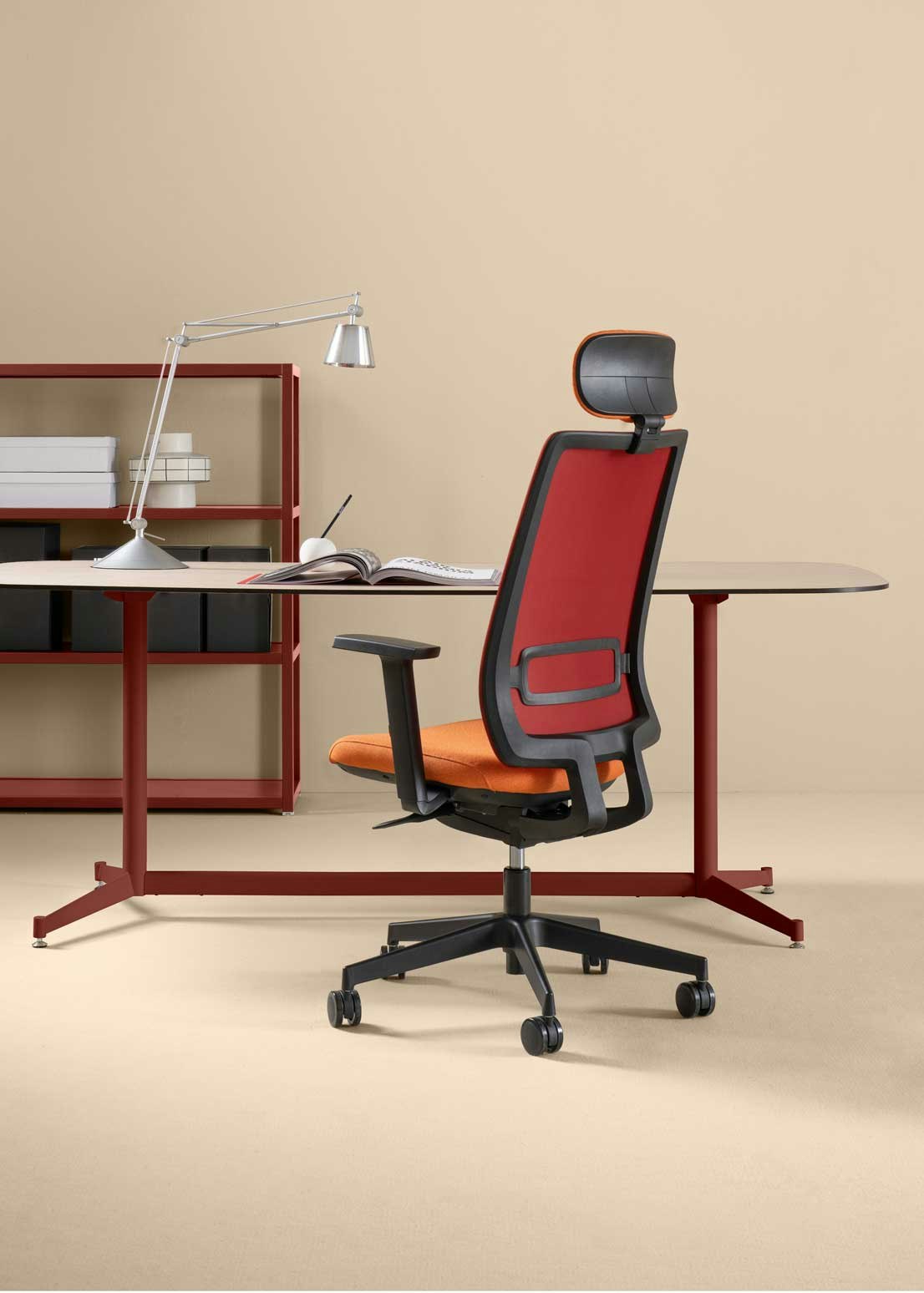 Task chair characterized by the extremely thin backrest and the application of this to the seat with double fixing.