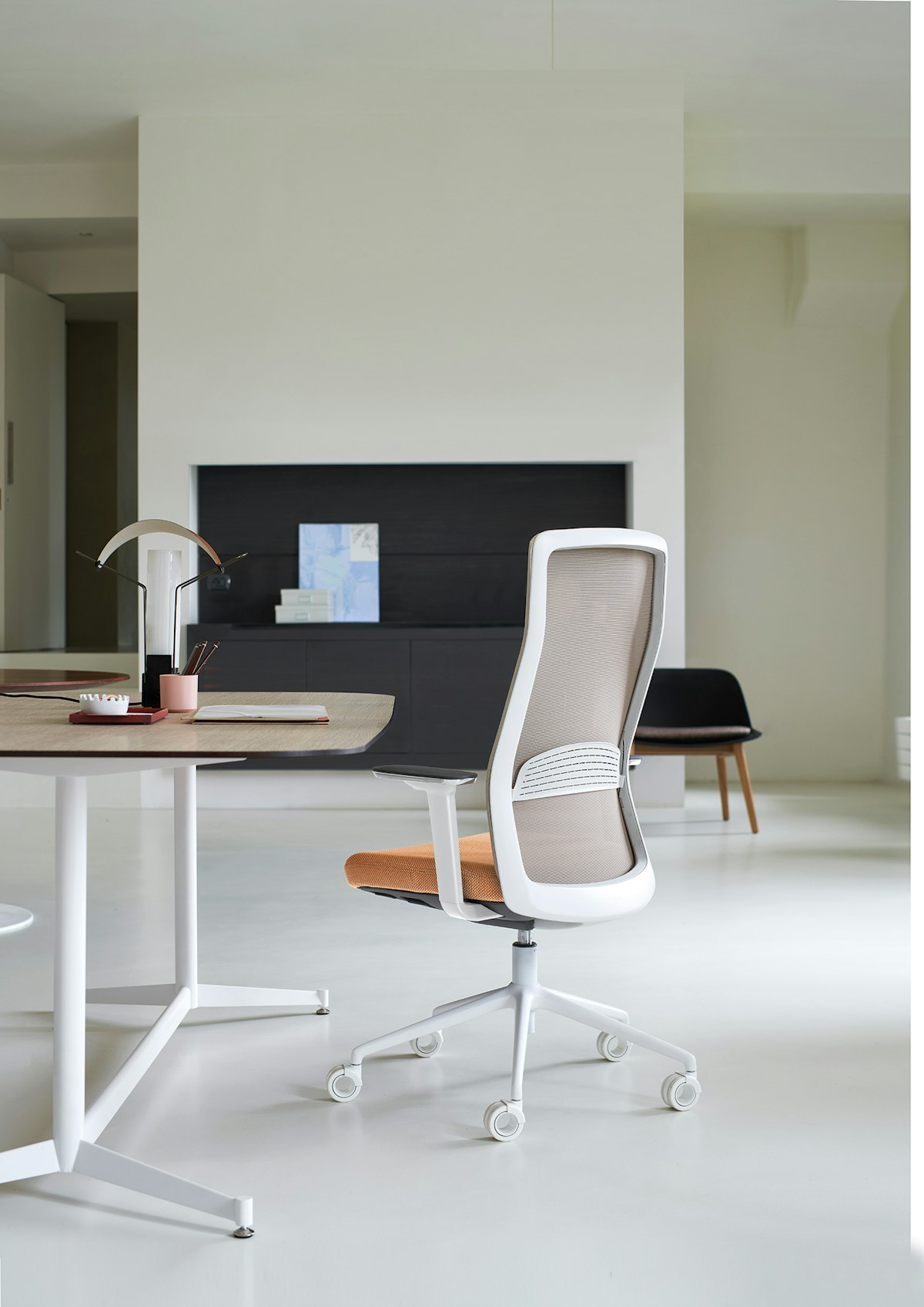 Task chair characterized by the extremely thin backrest and the application of this to the seat with double fixing.