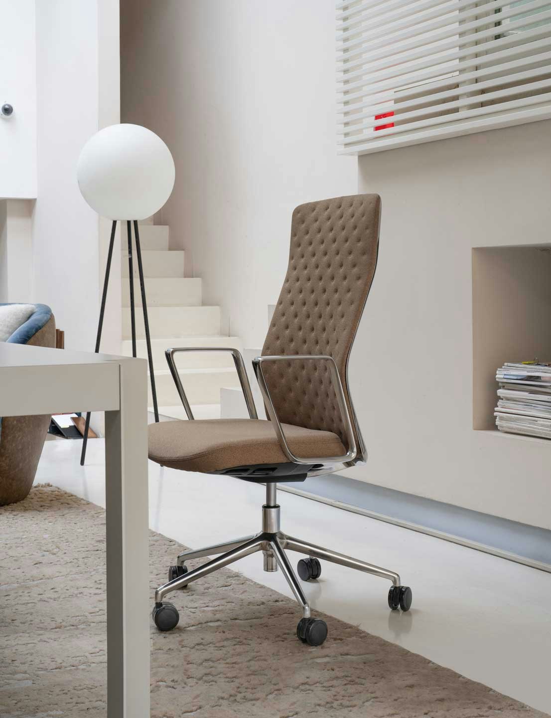 An armchair with an unique design, thanks to the original shape of the die-cast aluminum structure. That’s It Soft integrates the collection planned up to now with only the mesh backrest. The upholsteries integrate perfectly, giving extraordinary levels of visual and tactile comfort. Elegance and refinement are renewed for an executive chair of the highest level.