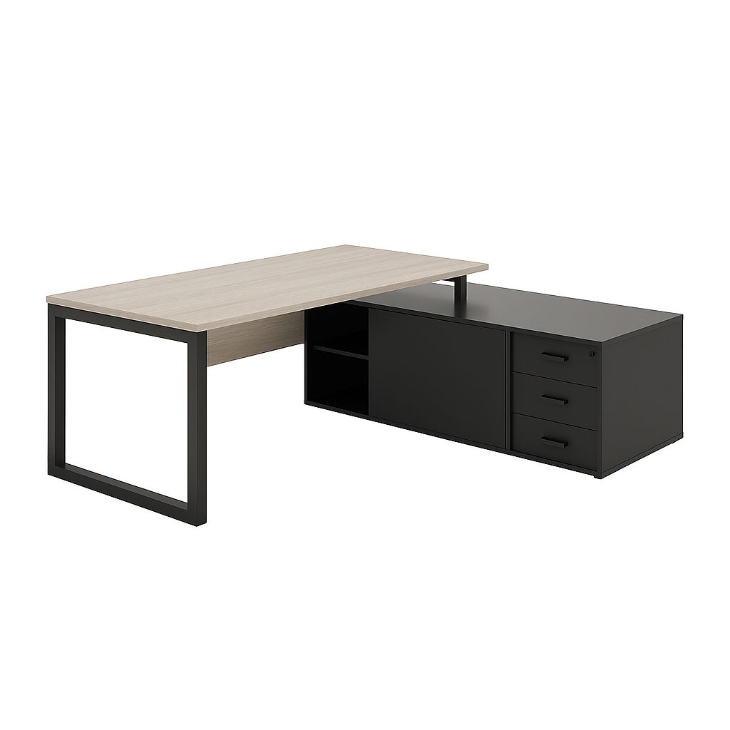 This sleek L-shaped executive desk features a light wood top paired with a matte black frame and integrated storage unit. The desk includes a metal loop leg for open legroom, along with a side return that houses three lockable drawers and open shelving for organization. Ideal for contemporary offices, it combines functionality with a minimalist aesthetic.