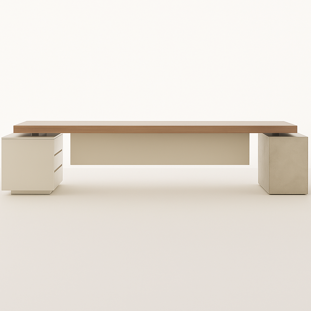 Arlo By Vanta – Electrically height adjustable topWood top : 60 mm thickTop with genuine leather padSide cabinet with 3 drawersSide cabinet top in woodSide cabinet body & front in lacquered woodSide cabinet top with top accessSide cabinet with internal traySide cabinet with compartment for cable managements & legModesty panel in lacquered woodConcrete basePainted metal height adjustable legsApproximate height range : 720 to 1200 mm