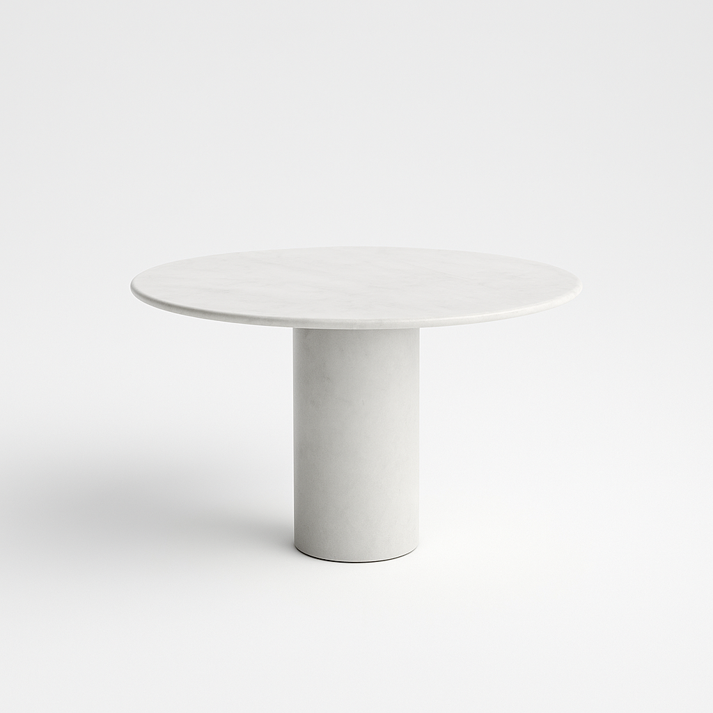 This elegant round dining table features a sleek white marble finish with a solid cylindrical base. Its minimalist silhouette and timeless material make it a refined centerpiece for contemporary dining spaces, blending luxury with simplicity. Perfect for both residential and upscale hospitality interiors.