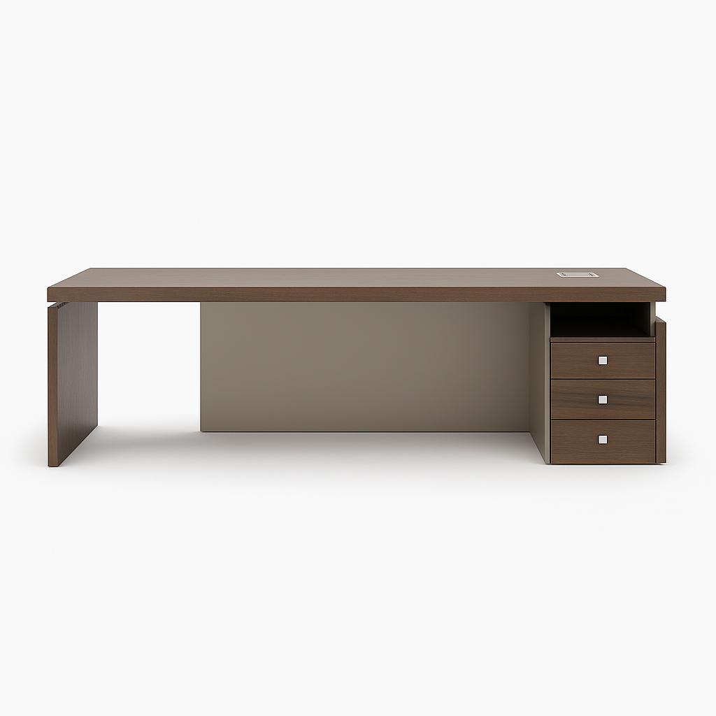 Kora By Libero – Desktop Dim.: 200 x 90 cm Full Height modesty panel Fixed pedestal 3 drawers soft closing Top access, cable tray & grommets Finishes : Veneer Finish/Lacquered Overall Dim.: 200 x 90x 75h cm