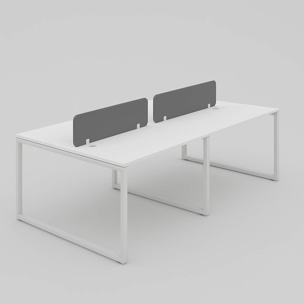 A clean and modern 4-person workstation featuring a sleek white rectangular frame and tabletop. Designed for open-plan offices, it includes central grey privacy screens that divide the space into two facing pairs, supporting focused work and team collaboration. Built-in cable grommets ensure organized cable management for a clutter-free workspace.