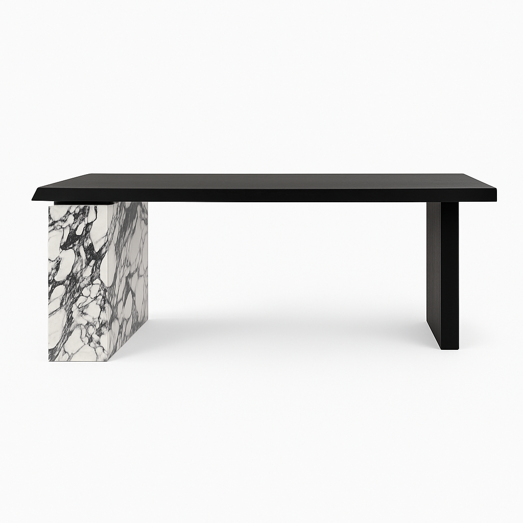 This striking modern executive desk features a bold black matte tabletop with a sleek, asymmetrical design. The left leg is crafted from luxurious white marble with deep grey veining, adding a touch of contrast. The right support is a solid black wooden leg, creating a minimalist and sculptural balance. Perfect for contemporary office settings, the design blends natural stone elegance with architectural simplicity, offering both style and stability