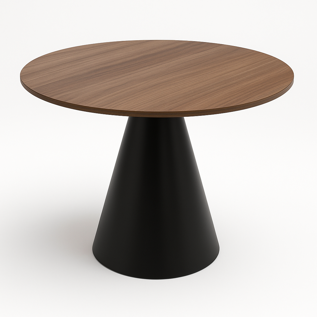 The Rovella round table features a 120 cm diameter melamine top, supported by a sleek conic steel base with a powder-coated finish. The top is securely fixed to the base using wooden blocks and a special German bonding process. The table stands at a height of 75 cm and does not include a PDU, making it a stylish and minimalist option for various office or meeting environments.