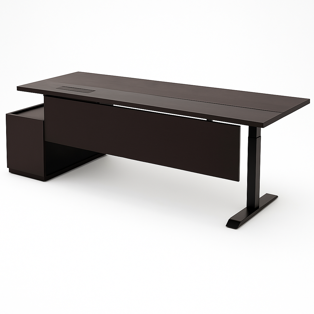 SKODA Executive Desk The Skoda executive desk features a height-adjustable veneer top, with leather accents for a sophisticated look. Measuring 200 x 90 cm, this desk is designed for comfort and style, and it includes a modesty panel for added privacy. It is equipped with cable management solutions, including an access box, tray, and vertebra. The service unit includes three drawers and open shelves for additional storage. This desk is perfect for executive offices that require both functionality and elegance.