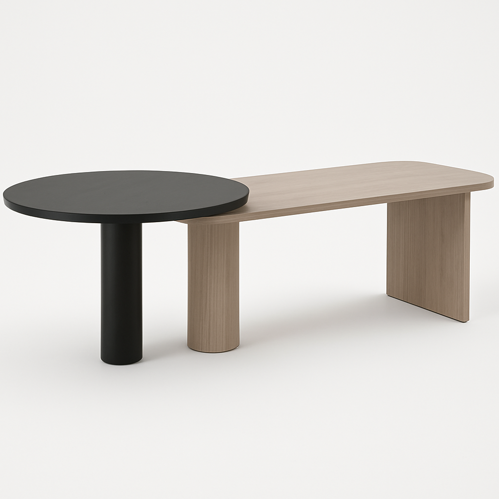 Sora By Vanta – made with Veneer with Round & rectangular top (with round edge) upon veneer legs (with cable management) – Size: 1650 x 725 + Dia 1000mm
