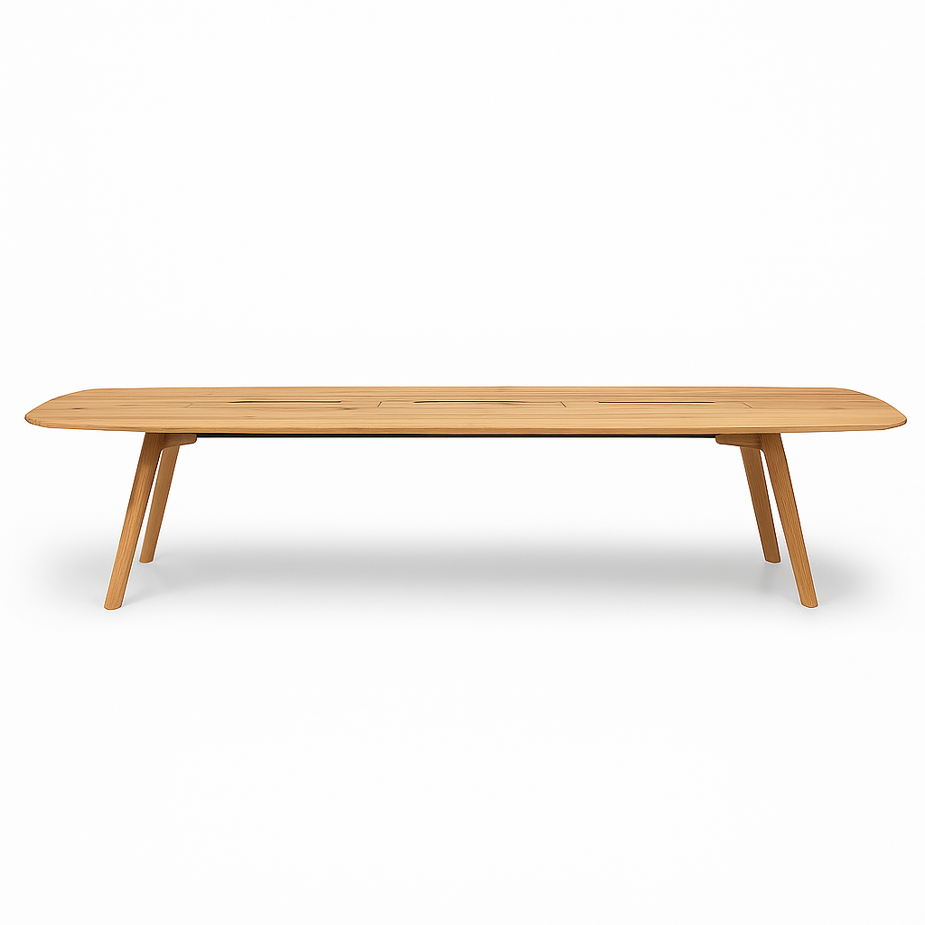 Valeo By Vanta – With Veneer top (Oval) with bevelled edge- size: 220 x 85 x 74H cm, upon wooden legs & frame – with cable management (access box, cable tray & vertebra